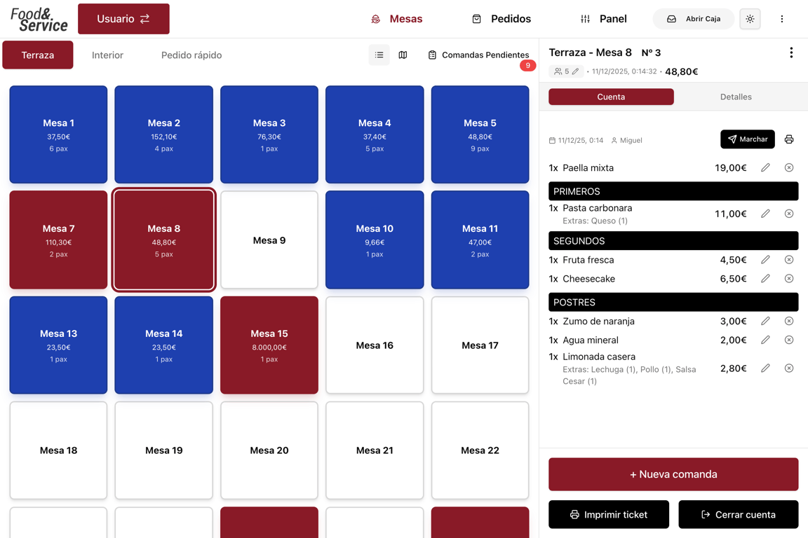 Mapa interactivo de tu local con el estado de cada mesa en tiempo real. Ocupación, tiempos, pedidos pendientes y cuentas abiertas de un vistazo.